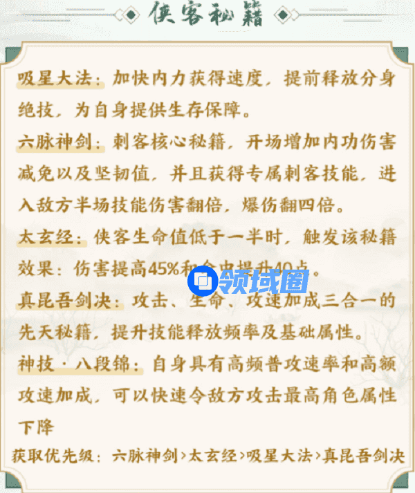 2.六脉神剑:刺客核心秘籍,开场增加内功伤害减免以及坚韧值,并且获得专属刺客技能,进入敌方半场技能伤害翻倍,爆伤翻四倍。