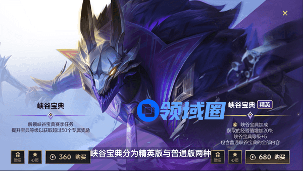 除免费奖励外,召唤师还可以选择购买峡谷宝典,解锁更多奖励!峡谷宝典分为普通版和精英版两种类型,购买精英版将直接提升5级宝典等级并且获得20%额外宝典经验加成,帮助召唤师更快速升级峡谷宝典~