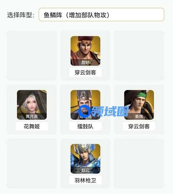 武将兵种搭配姜维(穿云剑客)魏延(穿云剑客)诸葛亮(擂鼓队)赵云(羽林枪卫)黄月英(花舞姬)