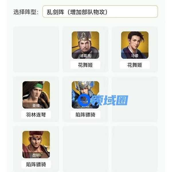 武将兵种搭配马谡(花舞姬)诸葛亮(花舞姬)赵云(陷阵骑兵)姜维(羽林连弩)魏延(陷阵骑兵)