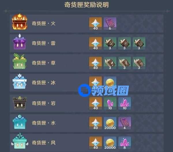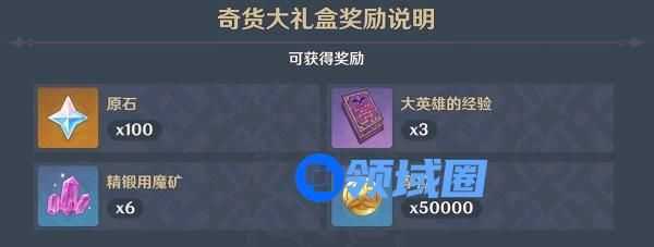 10.另外,累计兑换次数达到五次,还可以开启奇货大礼盒,获得丰厚的奖励。大礼盒简称彩匣,其奖励为100原石+5万摩拉+3本紫色经验书+6个魔矿。