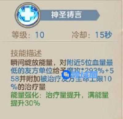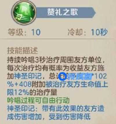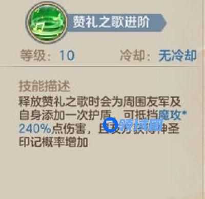 5、五技能赞礼之歌进阶是在赞礼之歌释放时添加一层以魔攻系数的小护盾,且增加获得神圣印记的概率。
