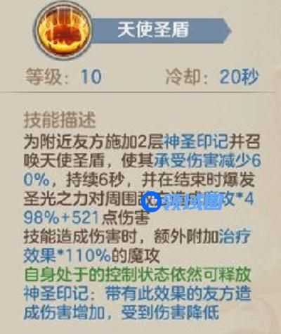 3、三技能天使圣盾是给自身级友方单位添加护盾及两层神圣印记,并减少所承受伤害的60%持续6秒,且在时间结束时爆炸对其附近的单位造成伤害(可以在被控时使用),伤害来源于自身魔攻以及治疗效果加成,对应被动是根据职业特色的能量体系,从而增加护盾爆炸时的技能伤害,最高提升50%。