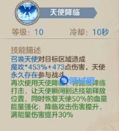 4、四技能天使降临是白贤者主要的伤害手段,直接召唤天使在敌对目标位置造成伤害,且永久存在(只限于PVE,PVP模式下天使有血量会被消灭),每次使用天使降临会回复天使50%血量,根据职业特色的能量体系可以增加天使降临时的伤害,最高提升30%,对应被动是在天使刚出现的范围内造成减速效果40%。