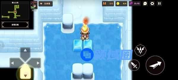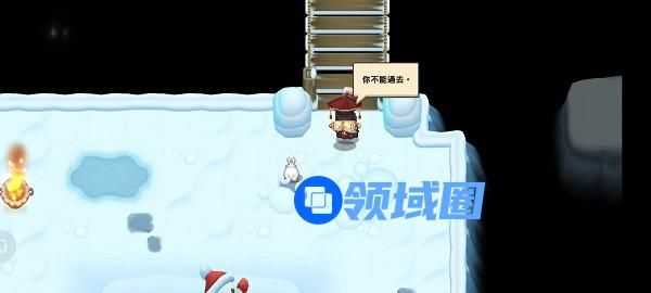 拿到火盆后沿着下图所示路径来到下图位置,然后用火盆将上方的冰块全部烤化