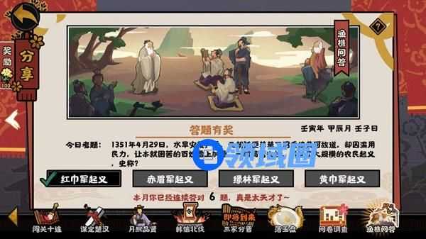 2.答案为红巾军起义,玩家们选择第一个答案即可获得奖励。