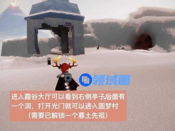 1、进入霞谷大厅可以看到右侧亭子后面有一个洞,打开光门就可以进入圆梦村。(需要提前解锁一个暮土先祖)