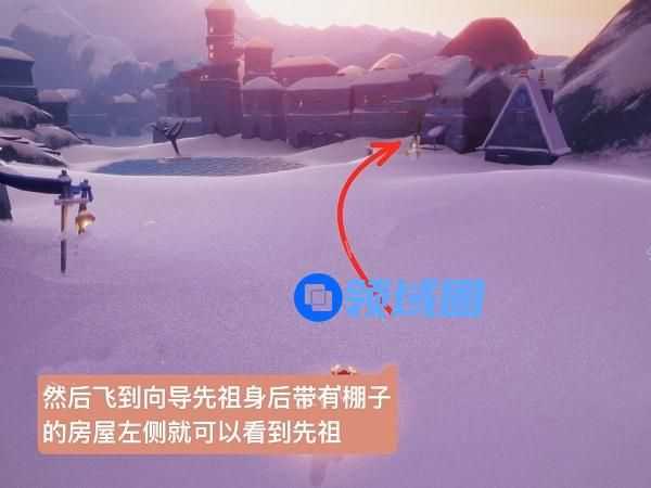 3、然后飞到向导先祖身后带有棚子的房屋左侧就可以看到先祖了。