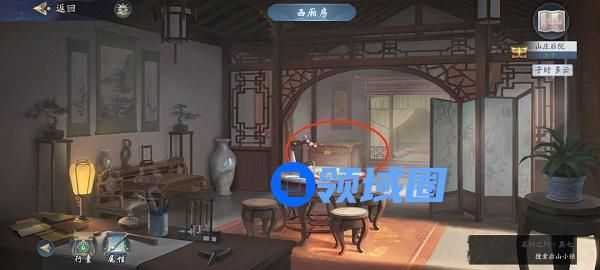 6、回到后院,点击楼顶,获取西厢房房门钥匙: