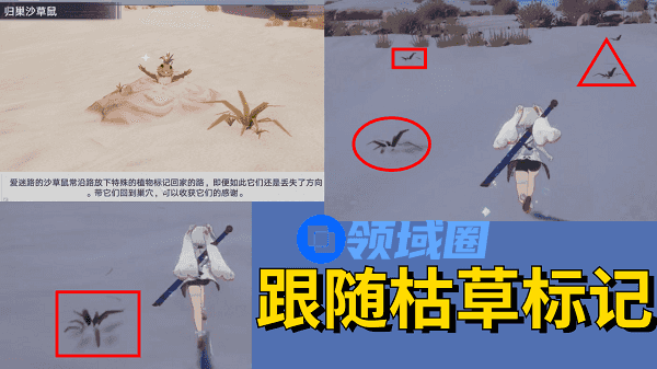 1.如图所示的会发光的土堆即为探索点。我们需要在附近找到且跟随枯草标记,找到沙团。