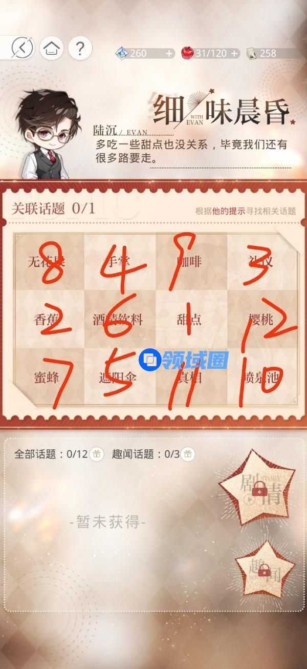 1、话题3顺序:1甜点,→2/3/4(礼仪/香蕉/手掌顺序),→5遮阳伞,→6酒精饮料,→7蜂蜜,→8无花果,→9咖啡,→10喷泉池,→11真相,→12樱桃。
