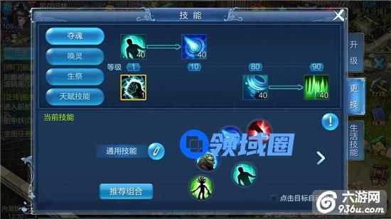 技能更换面板可以手动更换技能,也可以使用推荐组合由系统推荐合适的技能组合。