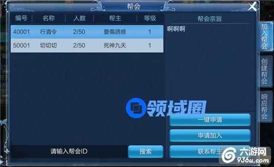 帮会界面,可以在你没有帮会的时候,帮助你查看现有帮会并提交帮会申请,当然你也可以自己创建或响应一个帮会。