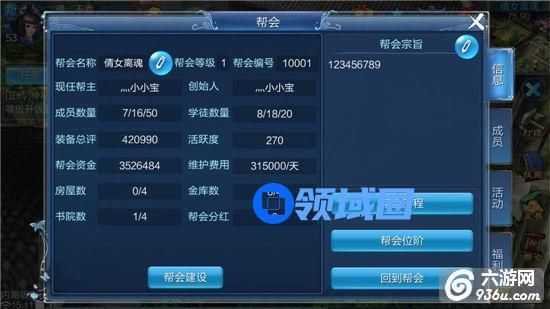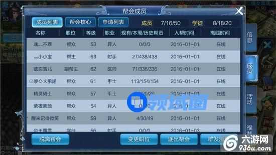 当你已经加入一个帮会之后,帮会界面可以帮你快速查看帮会信息及帮会成员。如果你是帮会管理人员,也可以在这里,对帮会成员进行管理和操作。