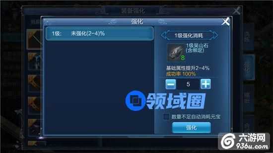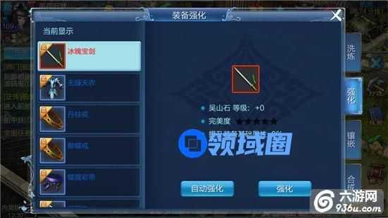 强化界面可以用吴山石强化装备的基础属性,根据吴山石的等级共分为20级。各等级吴山石可在元宝市场中购买。