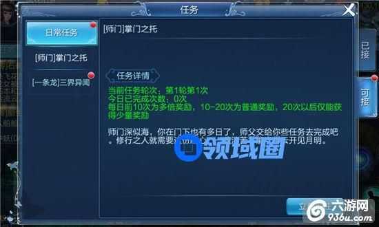 任务界面可通过任务栏上方的“任务”按钮打开,用于显示任务详情以及当前可接任务。