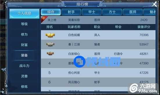 可查看当前各项参数中全服玩家的排名情况,并根据属性、职业等不同,制作了多个排行。