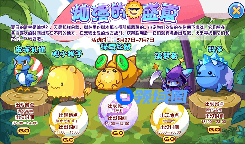 3、在这个盛夏,小宠物们悄悄的出来玩耍了,不同的时间段在指定的地图可以碰到它们!大家快来找他们一起玩耍吧。