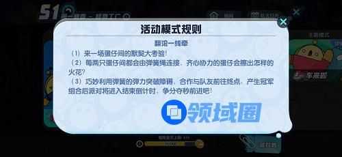 1、翻滚一线牵是固定一场的竞速赛,拿下第一名直接冠军,倒计时后结束游戏。该模式的特点在于蛋仔们是两两一组的,每一组的两个蛋仔都会被一根弹簧连接,最长能拉伸大概五六个身位,然后就会开始回弹,还是比较宽松的。