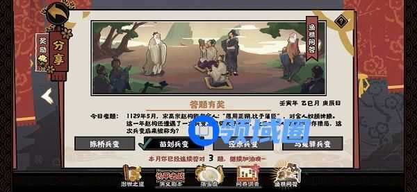 2.正确答案为苗刘兵变,玩家们选择第二个选项即可获得奖励。