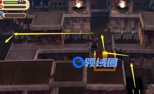 4、从中间的过道向前闯关,消灭第2个房间所有怪物后从右上角的机关上到墙上,走到墙壁尽头,获得【星星宝箱】。