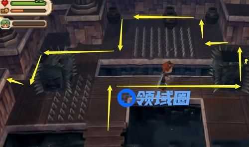 12、根据下图的路线闯过尖刺关卡,进入都是石像的房间,石像被激活后消灭所有石像(正面攻击石像不会受到任何伤害,需要从侧面或者背后攻击),打开向前闯关的门。
