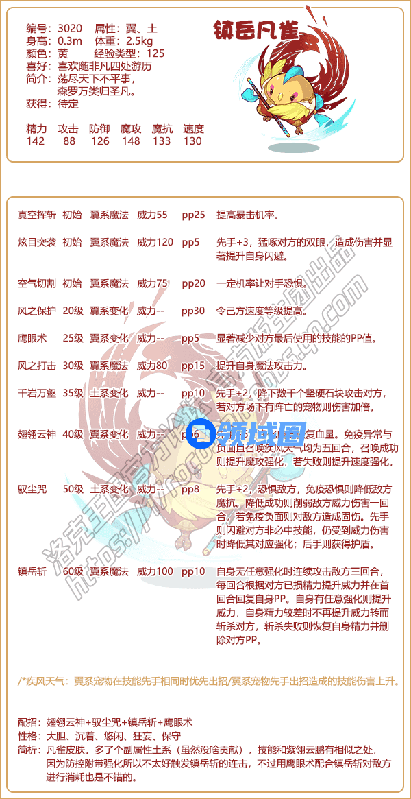 洛克王国镇岳凡雀是本周活动新上线的宠物之一,很多玩家还不清楚它有哪些技能,游戏宝小编带来洛克王国镇岳凡雀技能表,希望可以帮到大家。