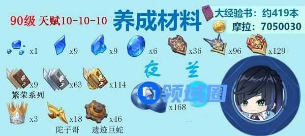 夜兰拉满需要6颗「涤净青金」、129个盗宝团掉落的「尉官的徽记」、168个「星螺」、3个「皇冠」、18个若陀龙王掉落的「鎏金之鳞」、46个遗迹巨蛇掉落的「符纹之齿」等材料。(备注:观察天赋书图案可以发现,夜兰需要的是「繁荣系列」天赋书)