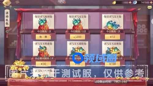 每日灵气元宝包:含奇境灵气*1,售价200元宝,活动期间每日可购买10次。