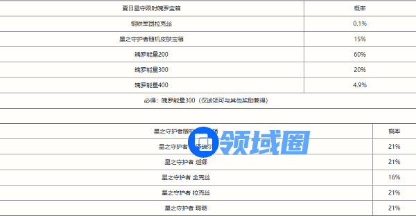 3、 夏日星守限时魄罗宝箱,打开10次至少掉落1个星之守护者随机皮肤宝箱或钢铁军团拉克丝。星之守护者随机皮肤宝箱概率始终为15%,若前9次未抽中星之守护者随机皮肤宝箱,第10次必掉或钢铁军团拉克丝皮肤。