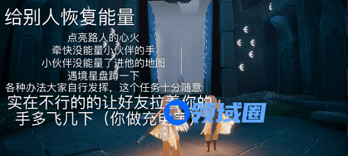 1、向其它玩家传递能量」给快没能量的玩家回复能量(大叫,牵手,点蜡烛),和好友手拉手进一个地图,去云野点亮一个无翼,实在不行的的让好友拉着你的手飞几下(你做充电宝)就行了。