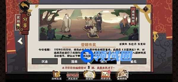 4.渔樵问答中每天都会有各种各样的题目,大部分为历史知识,也有一部分为游戏内知识,游戏宝手游网将会每天持续更新答案,欢迎大家关注。