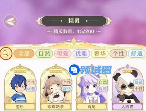1、打开游戏,进入精灵养成页面,点击如图所示的放大镜。