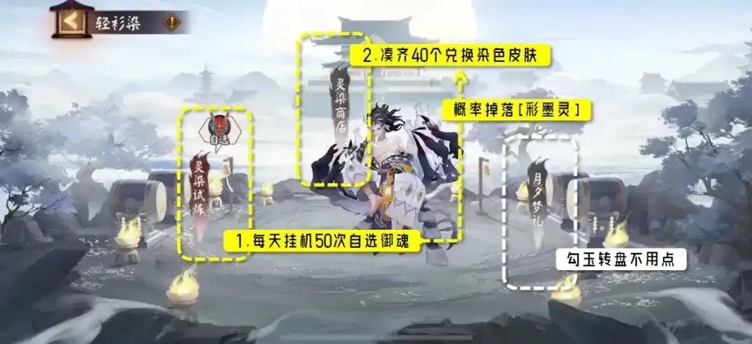 1、建议每天挂机试炼50次,有自选御魂2、如果想减负,可用SP皮肤券兑换10个[彩墨灵]