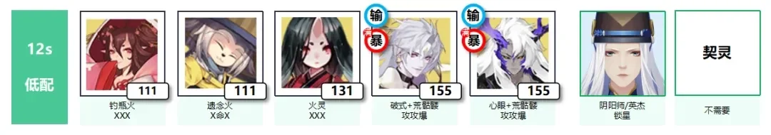 备注:全员妖术自动,源赖光入场动画比小晴明更快。如果面板不够就还用小晴明就好,这样输出御魂压力没那么大;或者祸津神带个速度开妖术。祸音灯任意两个增伤可用吞卷替换