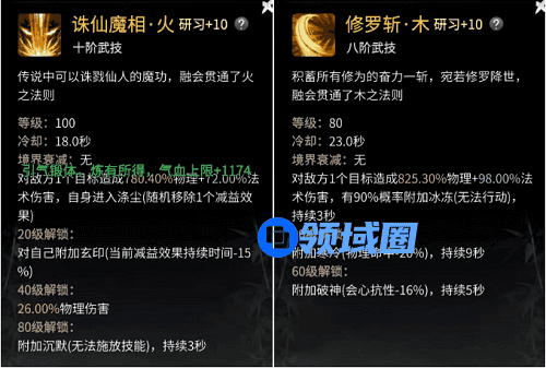 3、诛仙魔相·火 / 修罗斩·木:较推荐的两个控制技能,这里没有选择诛仙魔相·土的致盲,一是因为持续时间较短,二是因为致盲不能阻止对手开盾,实用性上没有沉默和冰冻强。