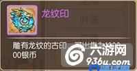 龙纹印在“商铺─其他”中可花费10元宝直接买到,而它又是换取银币最佳的途径之一。一件龙纹印可以出售获得10万银币。简单的比例就是元宝:银币=1:10000