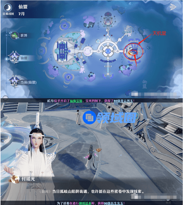 2、到仙盟地图左侧的天机堂南侧书架边走动即可触发。
