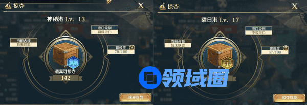 3. 掠夺港口可获取不同的物资;同时,被掠夺的港口等级越高,掠夺的收益越高,掠夺时将会更加困难;收益与风险并存,各位领主还需量力而行。