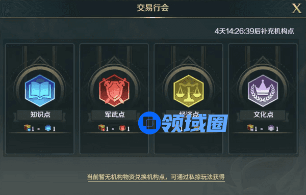 4. 联盟盟主或官员可将掠夺而来的物资在交易行会界面兑换成联盟机构点,用于提升国家的机构等级、提高王权值,从而获取关键城池攻打权限,领先于其他联盟的发展进程!