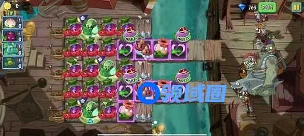 推荐阵容:双大嘴熊果荸荠竞速阵,因为陆地僵尸都聚集在2、4路,所以后期排队极长,每排都需要双大嘴加瓷砖联动进行双拉扯出怪,来尽量减少排队的长度并配合熊果和荸荠辅助过波从而加快通关速度,因为只有2 4路有甲板所以要双魔甘收尾。
