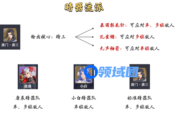1.首先目前游戏中的暗器长图打法大概就3类阵容和5个细分玩法,其分别是唐晨暗器队、小白暗器队和标准暗器队,而唐晨暗器队和标准暗器队都可以细分为【暴雨梨花针】和【孔雀翎】的单桩或多桩打法,所以是3类阵容和5个细分玩法。