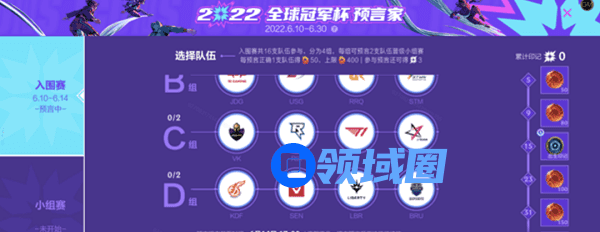 (1)入围赛共16支队伍参与,分为4组,每组可预言2支队伍晋级小组赛,一共可选择8支队伍进行预言。每预言正确1支队伍得龙魂水晶*50,上限400;参与预言还可得印记*3。