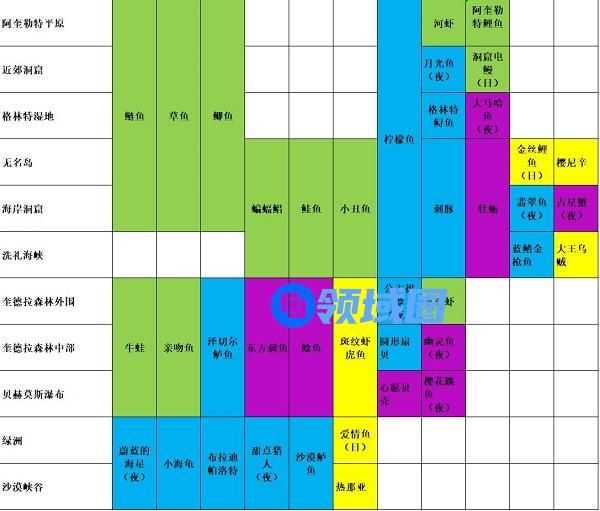 2、因钓鱼区分昼夜,日为白天钓鱼,夜为晚上钓鱼,部分鱼需要特定鱼饵,图中未标出。