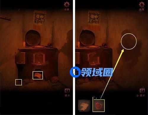 7、将【篾条】和【点燃的稻草】放入灶台处点火,用灶火烘烤【纸片】。(放道具不能点击同一个地方,比如先放入篾条,之后放入稻草要点击它附近的地方,如果点击篾条就会变成道具交换。)