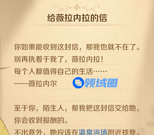 2、注意事项:捡到信后送给暖枫谷地温泉牧场北边的【薇拉内拉】,然后再回到捡到信的地方找到【薇拉内拉】完成任务。