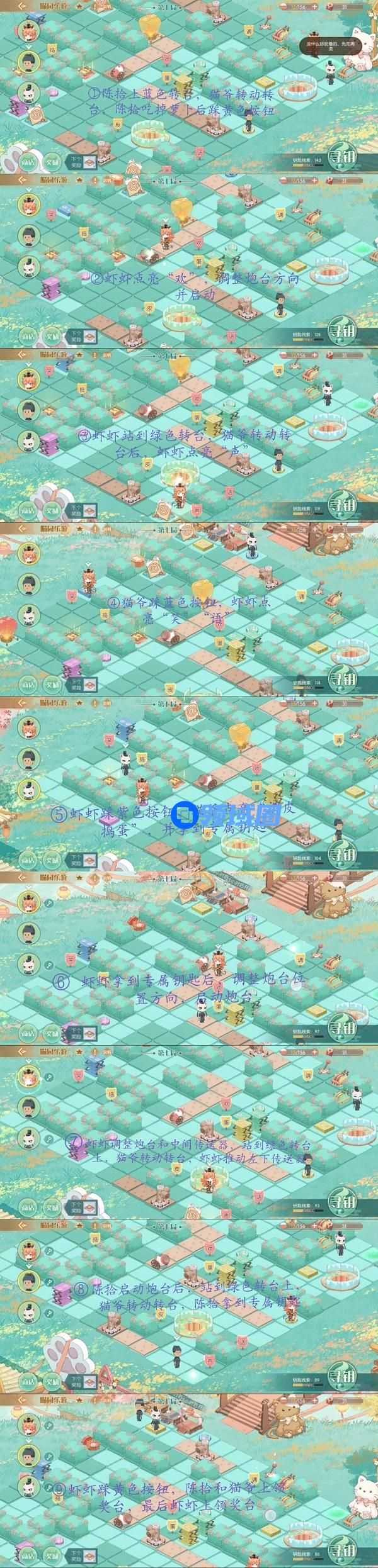 7、虾虾调整炮台和中间传送器,站到绿色转台上,猫爷转动转台,虾虾推动左下传送器。