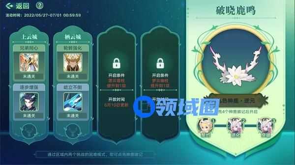 6、区域中的2个挑战都通过困难难度时,即可点亮对应区域的神鹿徽记,点亮神鹿徽记达到一定数量可以获得九色神鹿的契约、进化以及突破,点亮所有神鹿徽记即可解锁九色神鹿的逆元化挑战;