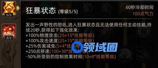 3.我们把狂暴状态点到两三级就差不多了,强化1如果不跨级打怪只需要点1级,抓紧点狂暴状态强化2和3,效果分别是免疫被击打硬直和高伤害大风车。