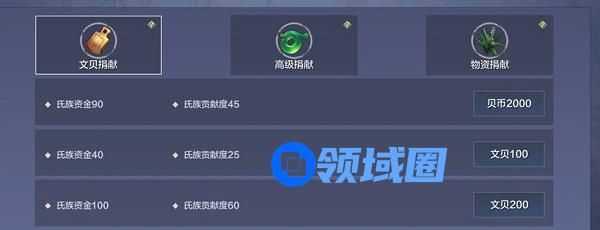 玩法:氏族界面左下角进入氏族贡献界面,根据捐献消耗会获得相应的氏族贡献(可于氏族商店购买灵韵,家具,朏朏进化丹粉末等物品)